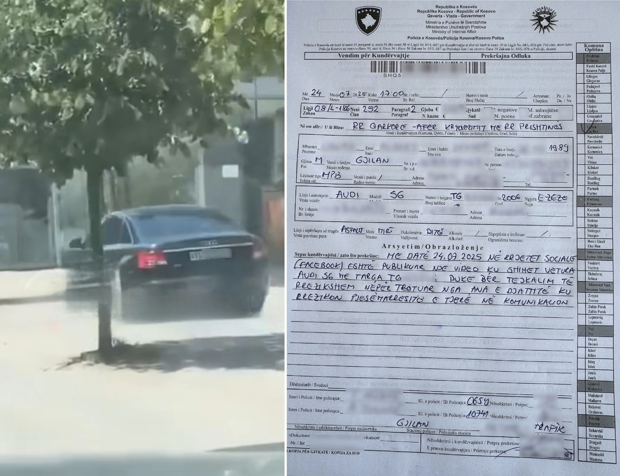 Një vozitës me automjet të tipit Audi S6, me targa zvicerane (TG), është ndëshkuar nga Policia e Kosovës pasi ka kryer një tejkalim të rrezikshëm dhe të paligjshëm përmes trotuarit, duke vënë në rrezik jetën e pjesëmarrësve të tjerë në komunikacion, përfshirë këmbësorët në zonën e një udhëkryqi në qytetin e Gjilanit.