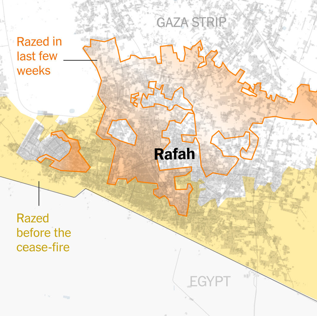 Rreth një milion palestinezë kishin ikur në Rafah si zonë të sigurt. Sot, pas përfundimit të armëpushimit në mars, ushtria izraelite ka shkatërruar zona të tëra të qytetit. Pamjet satelitore dhe dëshmitë nga terreni tregojnë për përdorim të demolimeve të kontrolluara dhe ndërtimin e bazave ushtarake të reja.
