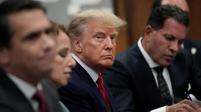 Ish-presidenti (president i rizgjedhur Nentor 2024) Trump në gjykatë para gjykatësit Juan Merchan pas dorëzimit të tij tek autoritetet e Nju Jorkut në Gjykatën Penale të Qarkut të Nju Jorkut më 4 prill 2023. (Fotografia e USA TODAY)