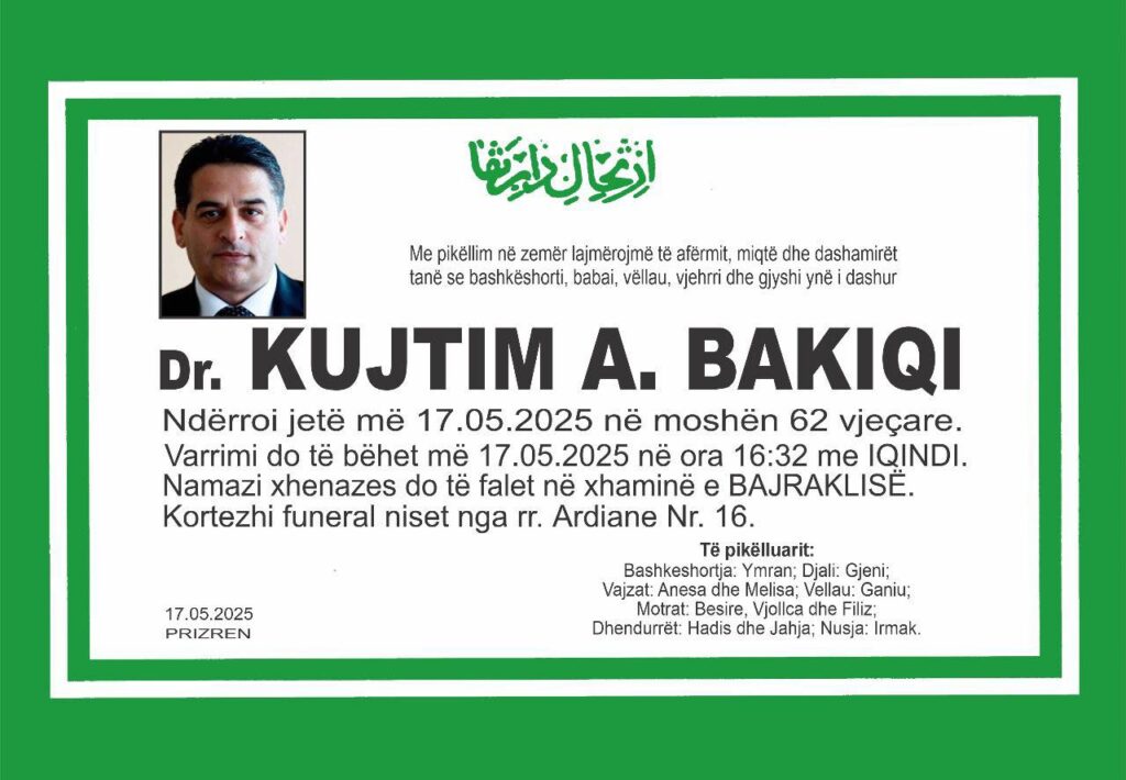 “Te dashur miq dhe dhashamirë, Me dhimbje të thellë ju njoftojme se më i dhashuri ynë, Dr KUJTIM BAKIQI, nderroji jetë sot në orët e hershme te mengjesit. Shpirti i tije pushofte ne paqe.”