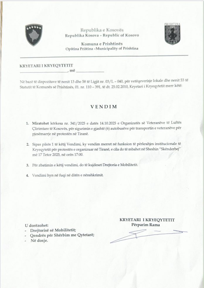 Komuna e Prishtinës ua ka siguruar gjashtë autobusë veteranëve, për transport drejt Tiranës për protestën e së hënës. Vendimin e ka nënshkruar kryetari, Përparim Rama.