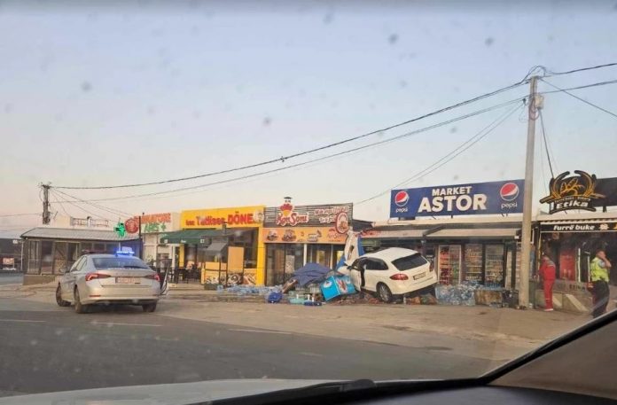 Një veturë është përplasur në dyqanet skaj rrugës. Nuk dihet nëse dikush ka pësuar lëndime, raportojnë mediat.