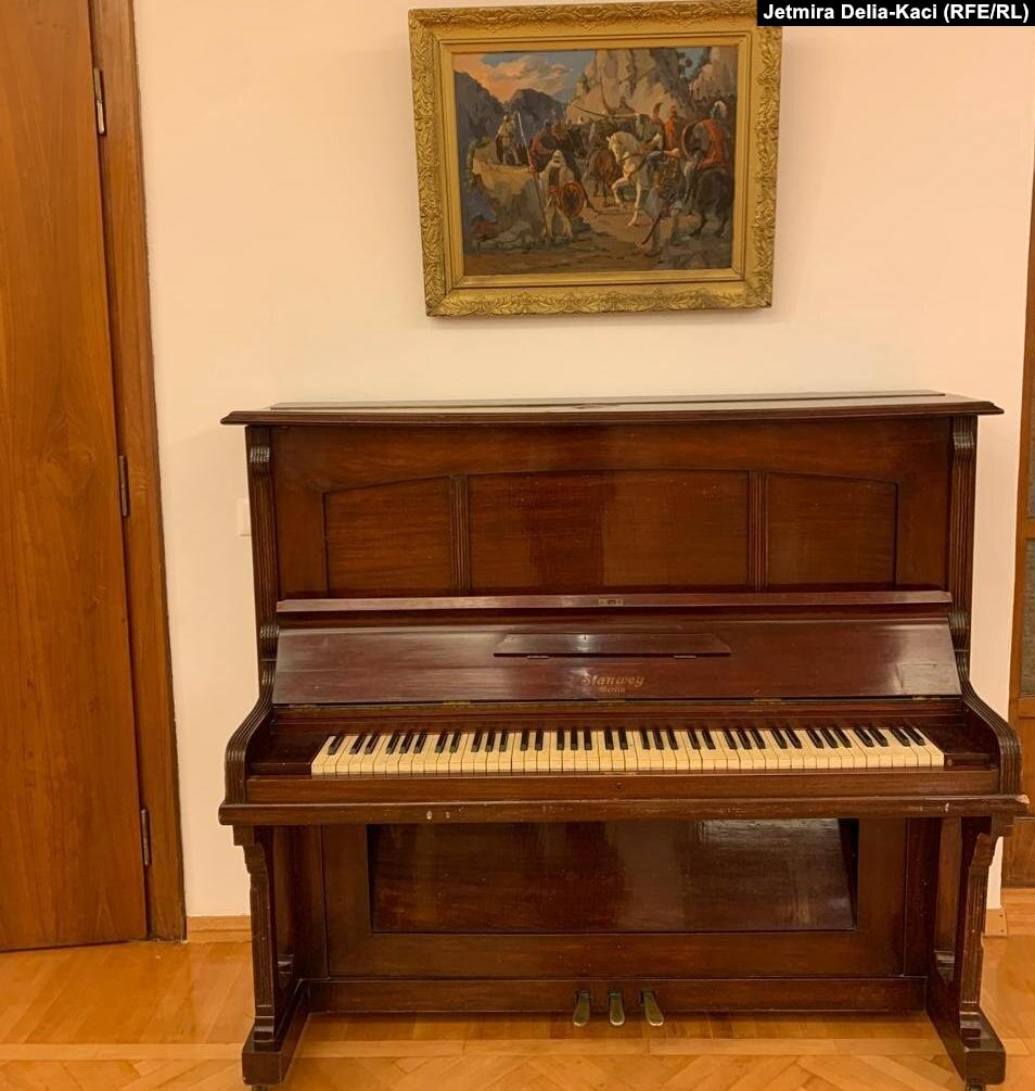 Një piano dhe një pikturë shihen në një nga hapësirat e vilës.