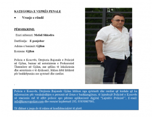 “Policia e Kosovës, Drejtoria Rajonale e Policisë në Gjilan, bazuar në autorizimin e Prokurorisë Themelore në Gjilan, me qëllim të lokalizimin dhe arrestimin e të dyshuarit, lëshon këtë kërkesë për bashkëpunim me qytetarë dhe mediat”, thuhet në njoftim.